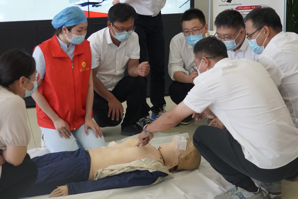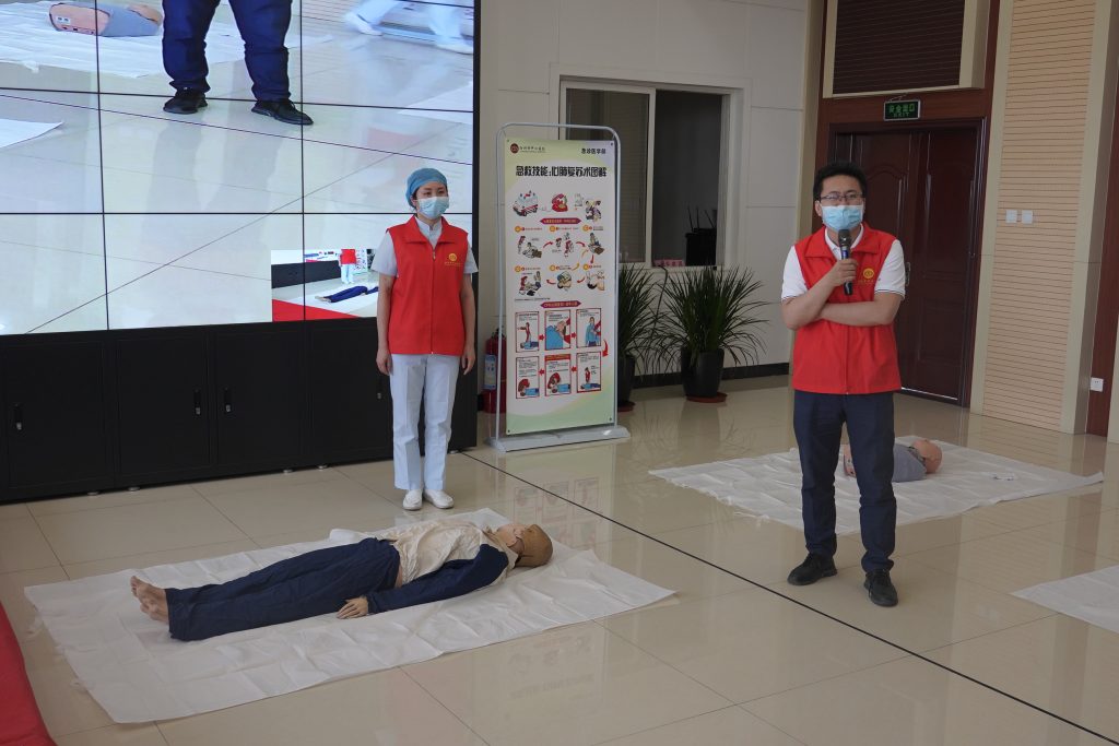 最后,王主任现场演示心肺复苏、包扎等应急救护技术,并邀请现场员工上台配合,为集团员工上了一堂生动的急救课。