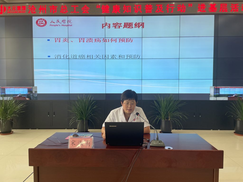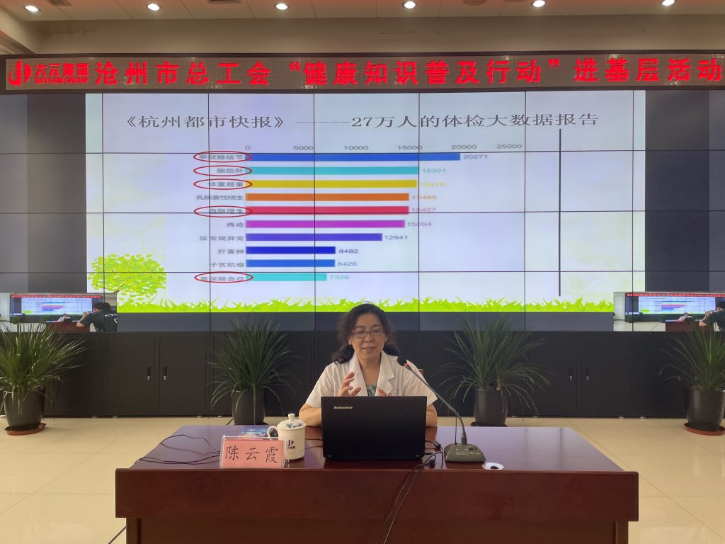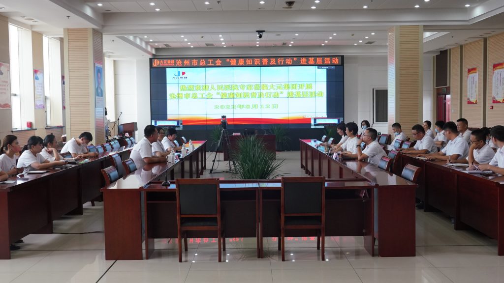 为进一步贯彻落实党中央、国务院健康中国行文件精神,充分发挥千亿官网职工健康生活室为职工健康保驾护航的作用,扎实推进关爱职工暖心工程建设,提高广大职工自我健康管理意识,8月12日下午,沧州市人民医院健康管理中心主任李德鹏、内分泌科主任,教授,硕士生导师陈云霞、消化一科主任宋淑莉莅临千亿官网开展“健康知识普及行动进基层”活动。千亿官网副总裁、工会主席张春荣、大元建业集团董事长、CEO助理王浩、集团总部党支部书记、党群文化中心总监王金英热情接待。集团总部机关全体人员现场参会。